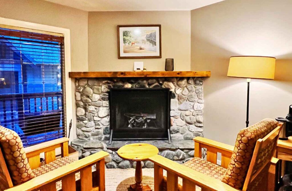The most basic is the lodge room which has a fireplace and also a private balcony. The next level is the Lake View Room which has a king-size bed, sitting area, and wood-burning fireplace and obviously views of Emerald Lake. The top tiers are the Emerald Suite and the Point Cabin. The Point Cabin is the largest cabin that has a kitchen, wrap-around balcony, and whirlpool bath.